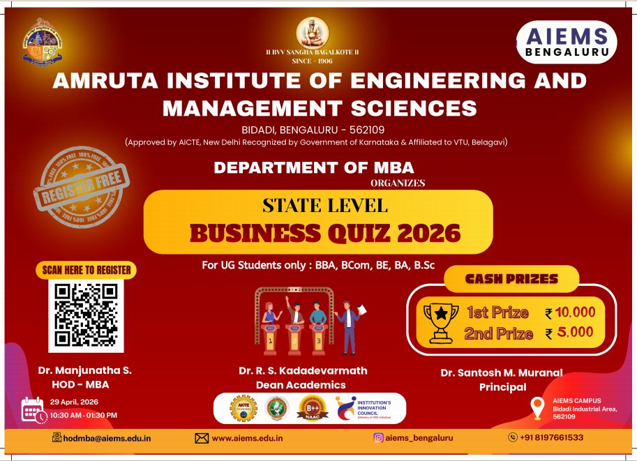 Amruta Institute of Engineering and Management Sciences (AIEMS) was established in 2008 in Bengaluru and is under the umbrella of Basaveshwara Veerashaiva Vidya Vardhak Sangha (BVVS), Bagalkot—a renowned educational trust with a strong legacy of excellence in education and value-based learning.